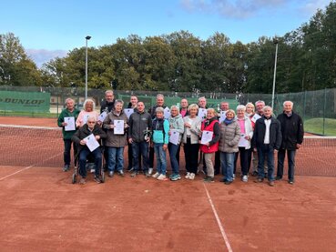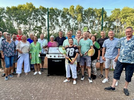 In diesem Jahr endete die erfolgreiche Tennissaison mit einem Sommerfest. Bereits am Mittag begann unter strahlendem Sonnenschein das Sommerfest mit unserem traditionellen Schleifchenturnier. Nach vielen spannenden Runden und interessanten Begegnungen haben sich zum frühen Nachmittag erstmal alle Spieler und Zuschauer bei Kaffee und Kuchen erholt und gestärkt, bevor bevor es dann in die finale Phase des Turniers ging. Bald daruaf standen die Gewinner fest. In diesem Jahr konnte sich Angela Schmidt die meisten "Schleifchen" erspielen, gefolgt von Beate Sacher und den dritten Platz sicherte sich Andreas Heine. Bevor der Saisonabschluss gebührend gefeiert werden konnte, erfolgten 25 Ehrungen unserer Vereinsmitglieder für besonders langjährige Mitgliedschaft (25, 30 und 45 Jahre) durch unseren Vereinsvorsitzenden Peter Fischer. Nach dieser Zeremonie und Übergabe der Urkunden und kleiner Präsente, konnten die knapp 50 anwesenden Mitglieder das reichhaltig gedeckte Büffet und den Grill plündern. Es wurde bis spät in die Nacht gefeiert erzählt und gelacht.